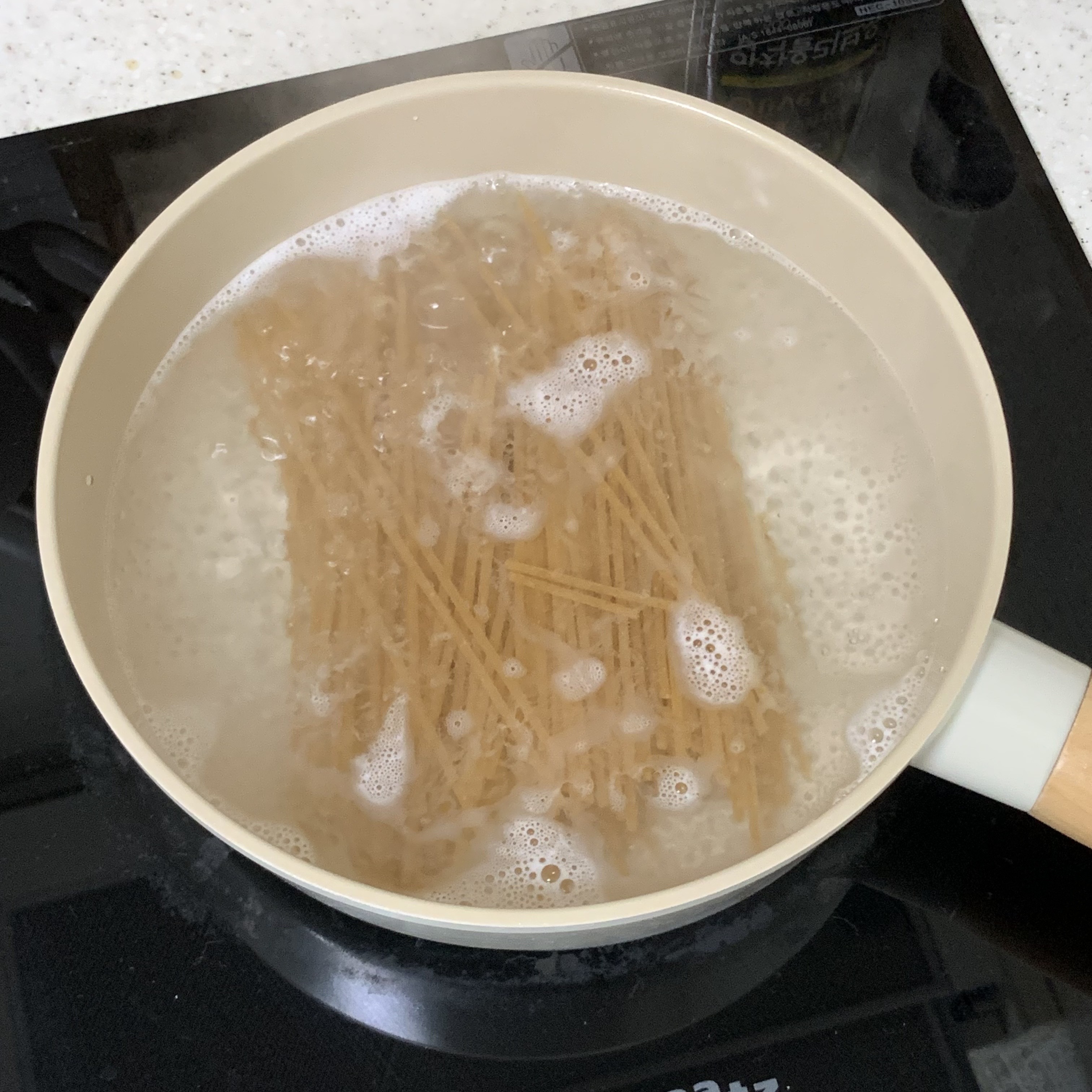 이때 작은 펜으로 하실 경우엔 파스타 면 반으로 잘라서 넣어주시면 좋아요